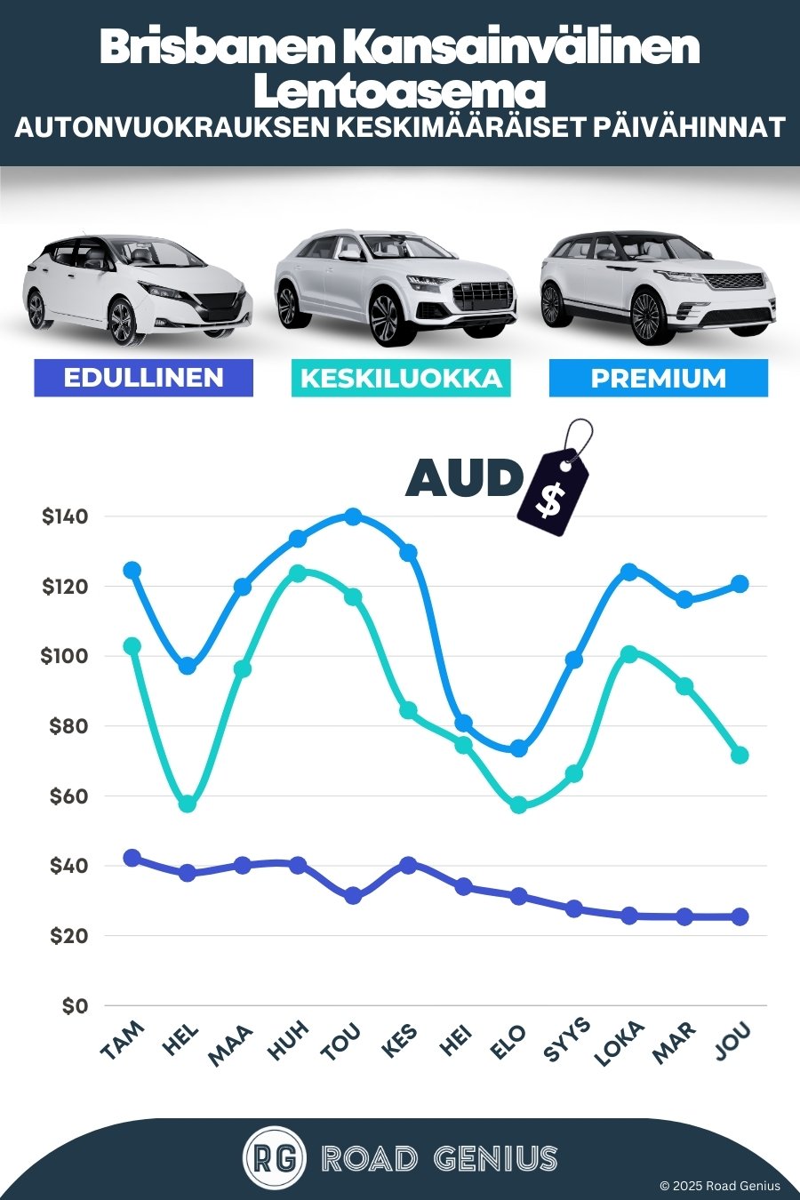 Keskimäärin auton vuokraaminen Brisbanen lentoasemalla (BNE) maksaa noin 103 AUD päivässä, ja edullisimmat hinnat alkavat 25 AUD päivässä.