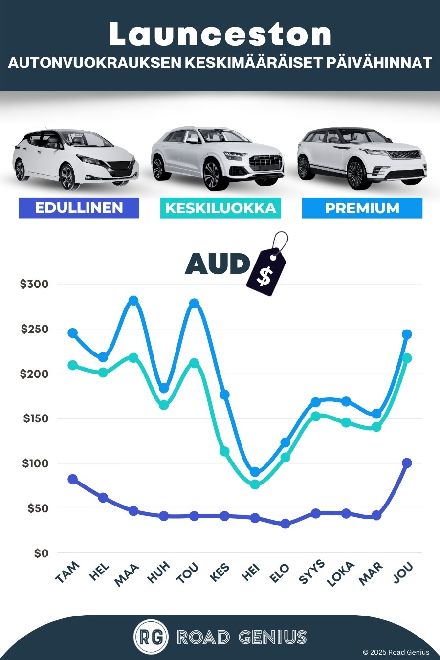 Keskimäärin auton vuokraaminen Launcestonissa maksaa noin 172 AUD päivässä, ja edullisimmat hinnat alkavat 32 AUD päivässä.