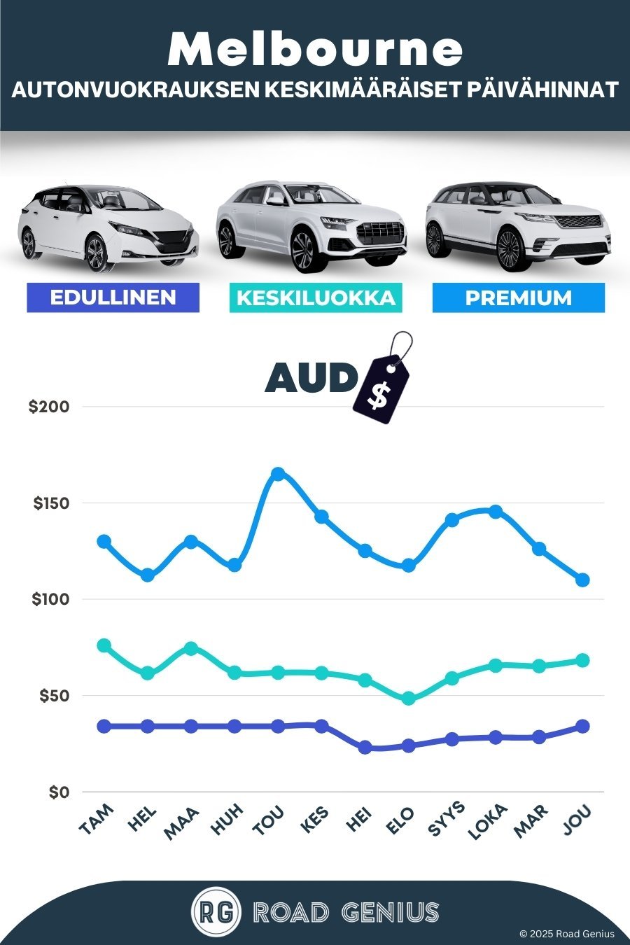 Keskimäärin auton vuokraaminen Melbournessa maksaa noin 104 AUD päivässä, ja edullisimmat hinnat alkavat 23 AUD päivässä.