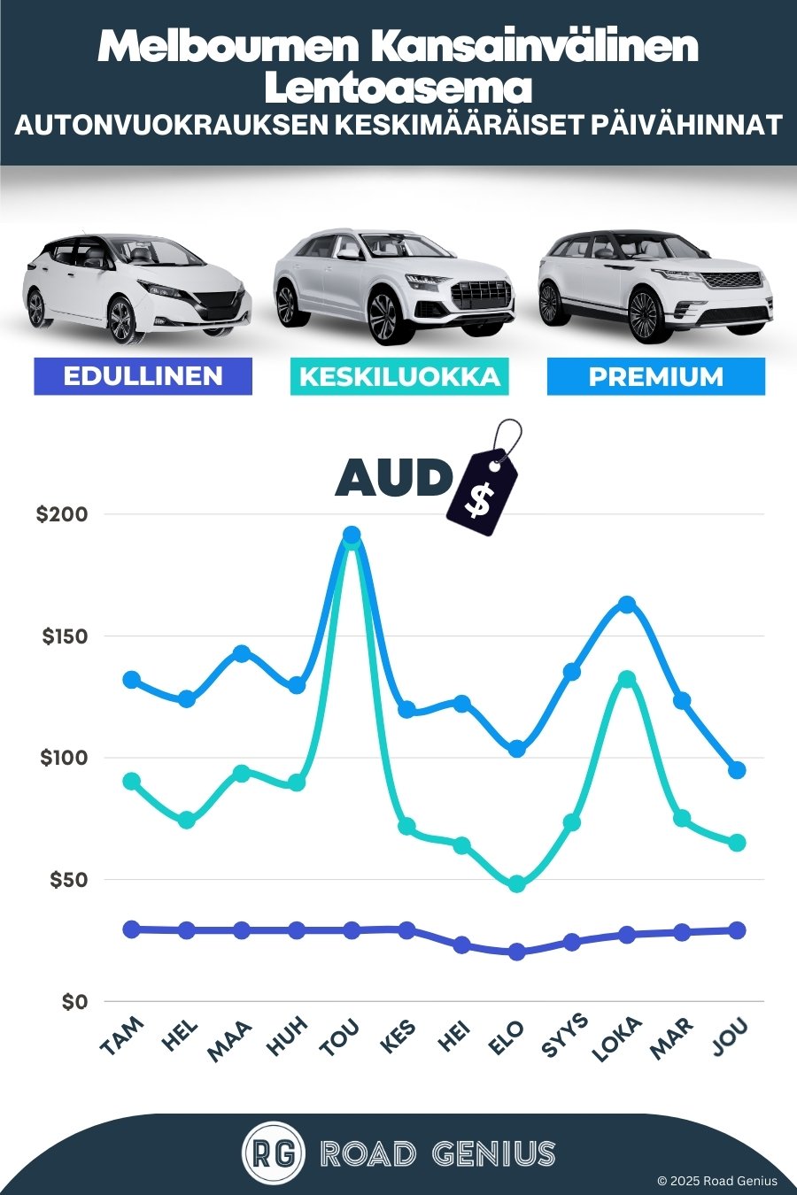 Auton vuokraaminen Melbournen lentoasemalla (MEL) maksaa keskimäärin noin 111 AUD päivässä, ja edullisimmat hinnat alkavat 20 AUD päivässä.