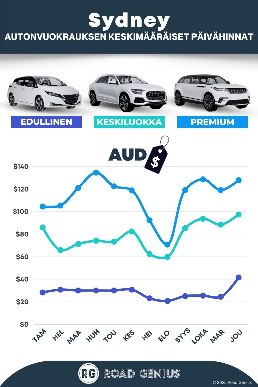 Keskimäärin auton vuokraaminen Sydneyssä maksaa noin 97 AUD päivässä, ja edullisimmat hinnat alkavat 21 AUD päivässä.