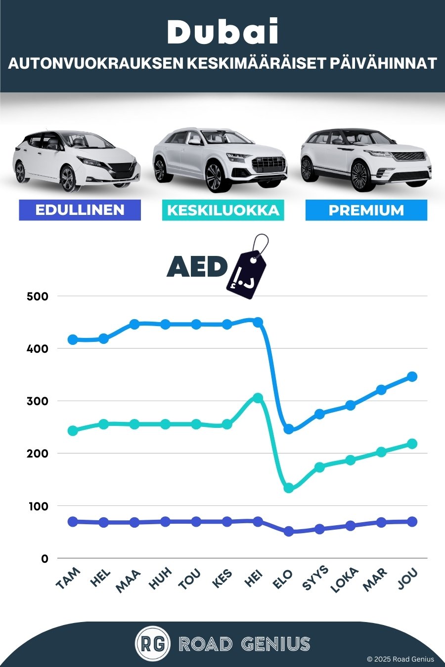 Keskimäärin autonvuokraus Dubaissa maksaa noin 224 AED päivässä, ja edullisimmat vuokraukset ovat saatavilla alkaen 51 AED päivässä.