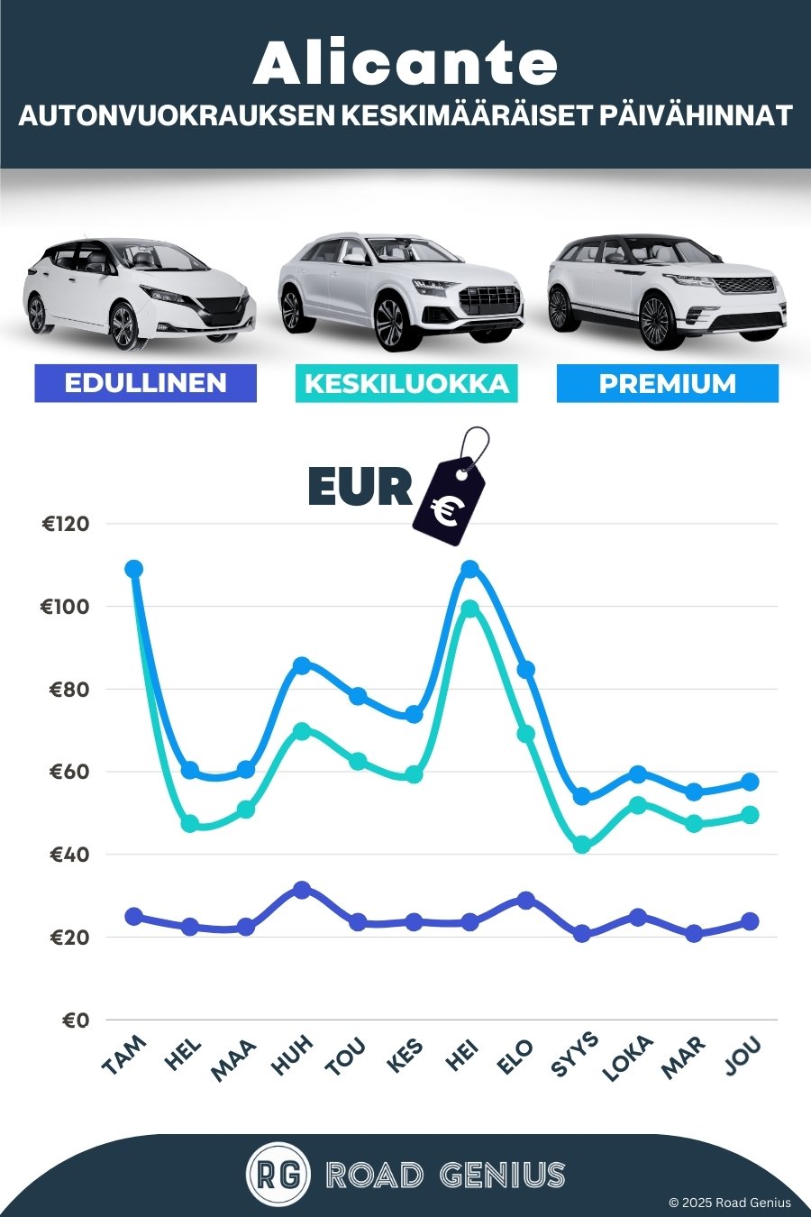 Keskimäärin autonvuokraus kohteessa Alicante maksaa noin €54 päivässä, ja halvimmat vuokraukset ovat saatavilla alkaen €21 päivässä.