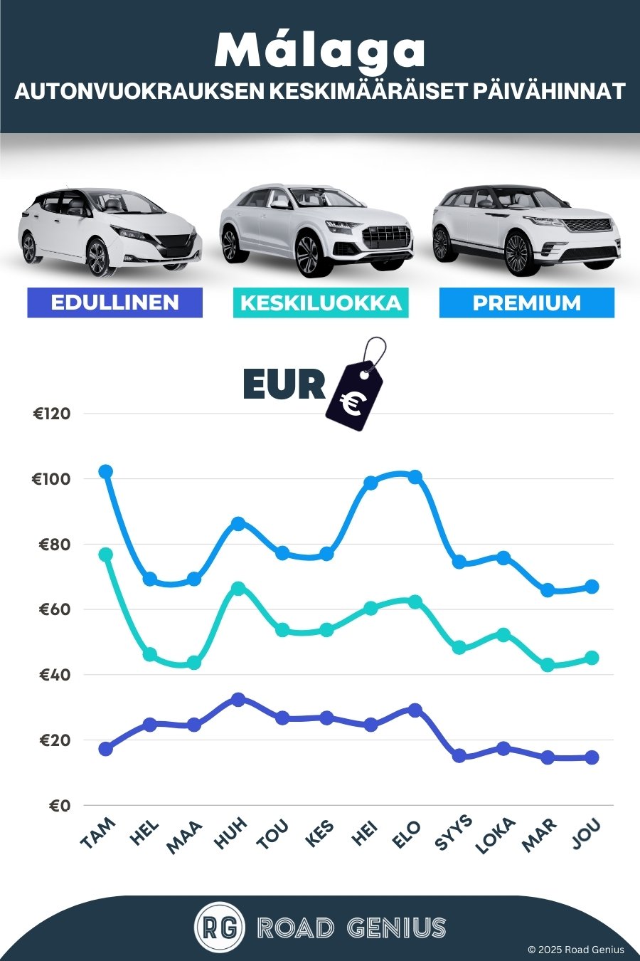 Keskimäärin autonvuokraus kohteessa Málaga maksaa noin €52 päivässä, ja halvimmat vuokraukset ovat saatavilla alkaen €15 päivässä.