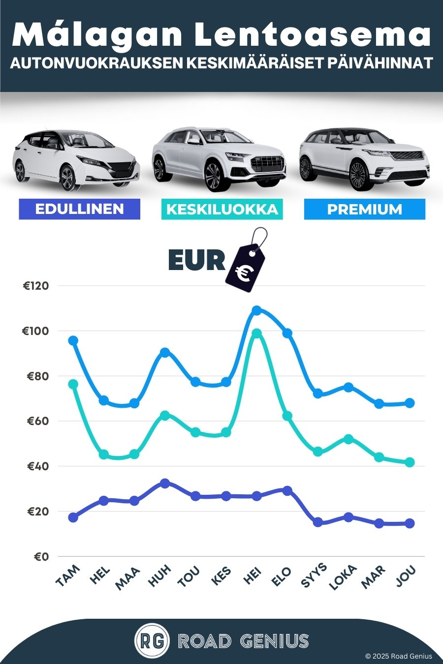 Keskimäärin autonvuokraus kohteessa Málagan lentoasema maksaa noin €53 päivässä, ja halvimmat vuokraukset ovat saatavilla alkaen €15 päivässä.