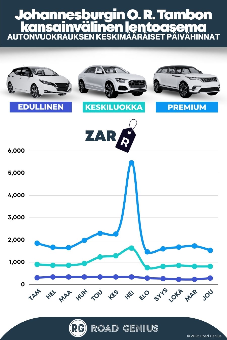 Keskimäärin autonvuokraus Johannesburgin O. R. Tambo -lentoasemalla maksaa noin 1 128 ZAR päivässä, ja edullisimmat vuokraukset ovat saatavilla alkaen 230 ZAR päivässä.