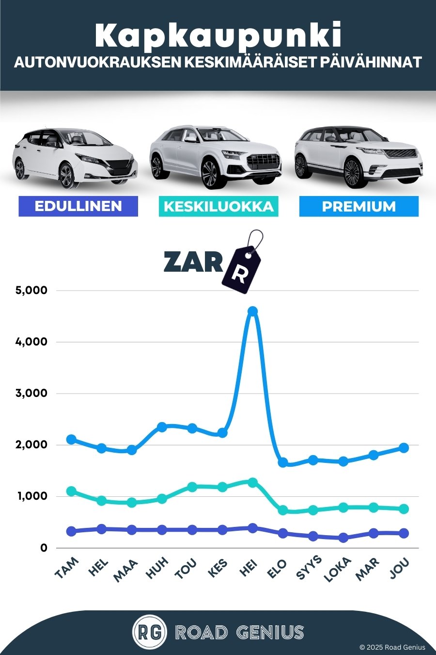 Keskimäärin autonvuokraus Kapkaupungissa maksaa noin 1 149 ZAR päivässä, ja edullisimmat vuokraukset ovat saatavilla alkaen 201 ZAR päivässä.