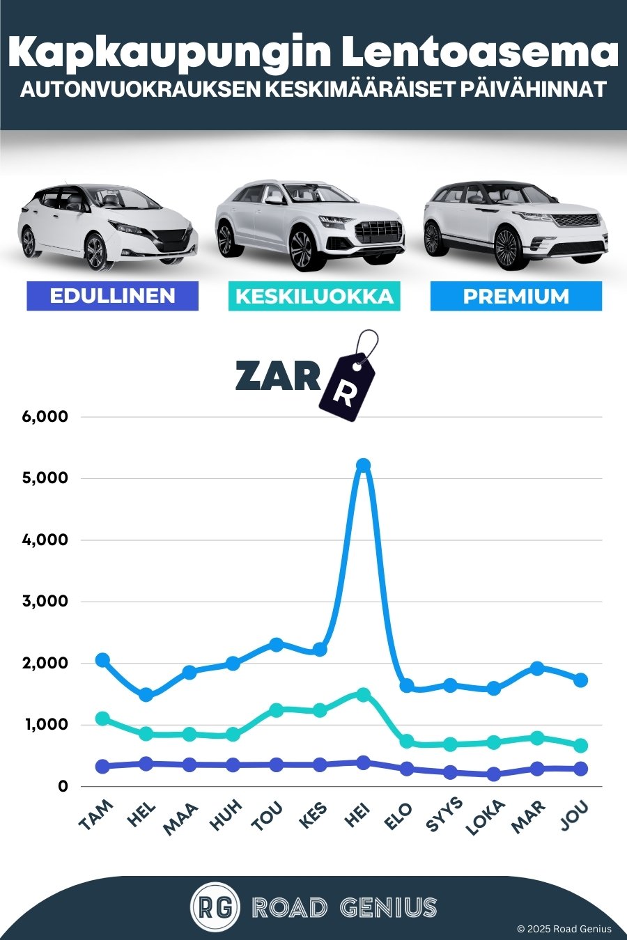 Keskimäärin autonvuokraus Kapkaupungin lentoasemalla maksaa noin 1 129 ZAR päivässä, ja edullisimmat vuokraukset ovat saatavilla alkaen 201 ZAR päivässä.