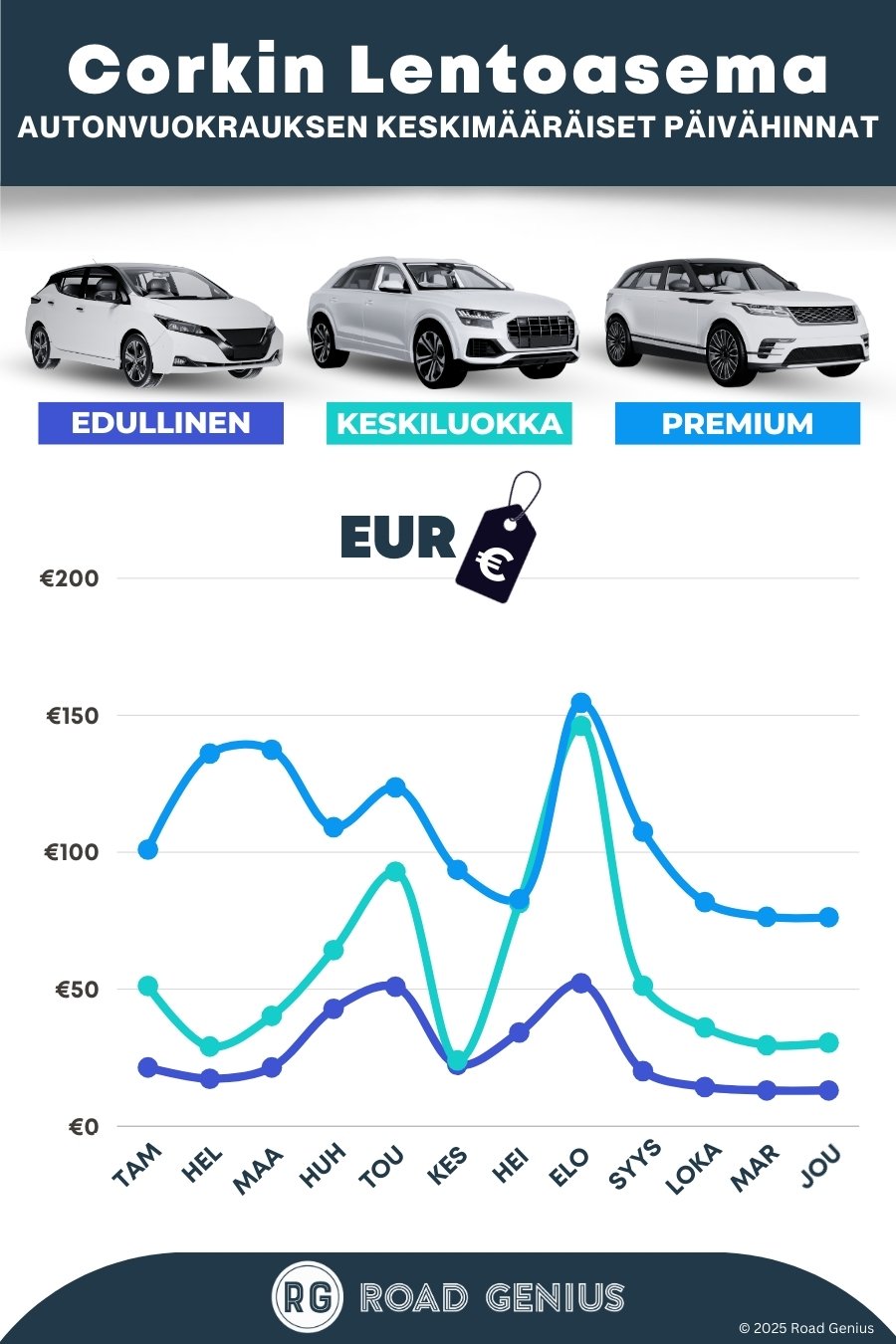Keskimäärin autonvuokraus kohteessa Corkin lentoasema maksaa noin €63 päivässä, ja halvimmat vuokraukset ovat saatavilla alkaen €13 päivässä.