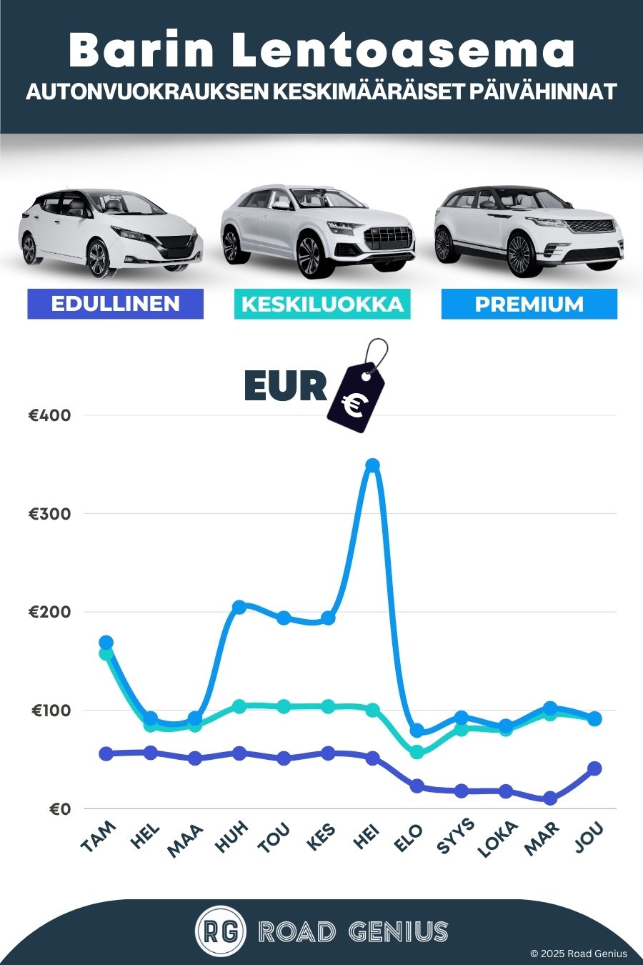 Keskimäärin autonvuokraus kohteessa Barin lentoasema maksaa noin €94 päivässä, ja halvimmat vuokraukset ovat saatavilla alkaen €11 päivässä.