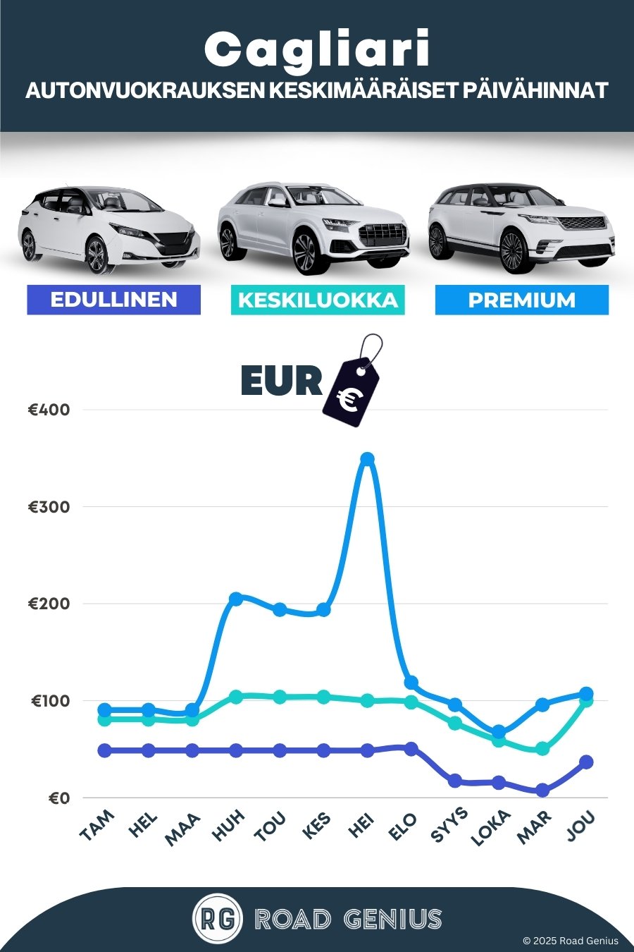 Keskimäärin autonvuokraus kohteessa Cagliari maksaa noin €89 päivässä, ja halvimmat vuokraukset ovat saatavilla alkaen €8 päivässä.
