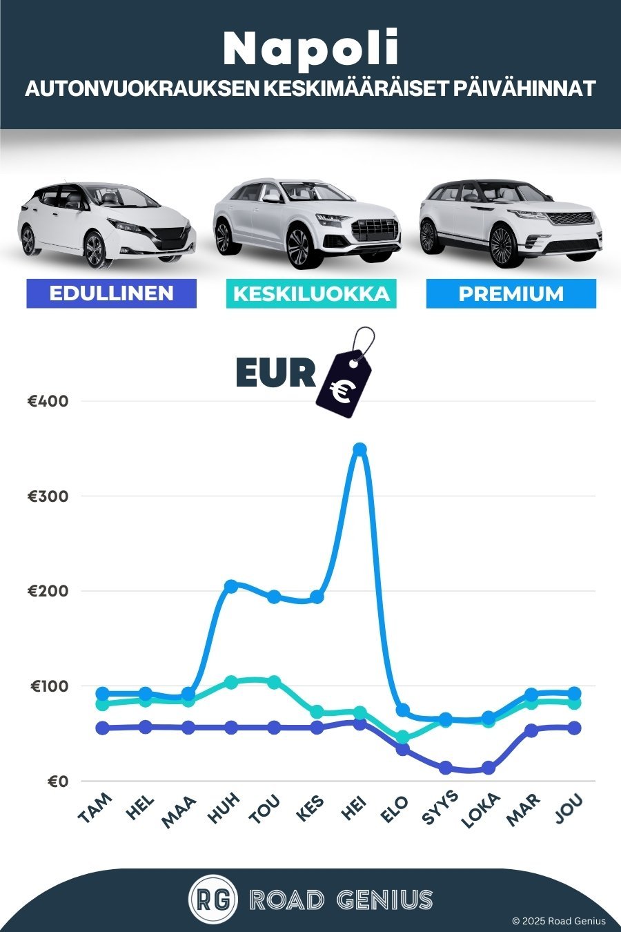 Keskimäärin autonvuokraus kohteessa Napoli maksaa noin €86 päivässä, ja halvimmat vuokraukset ovat saatavilla alkaen €14 päivässä.