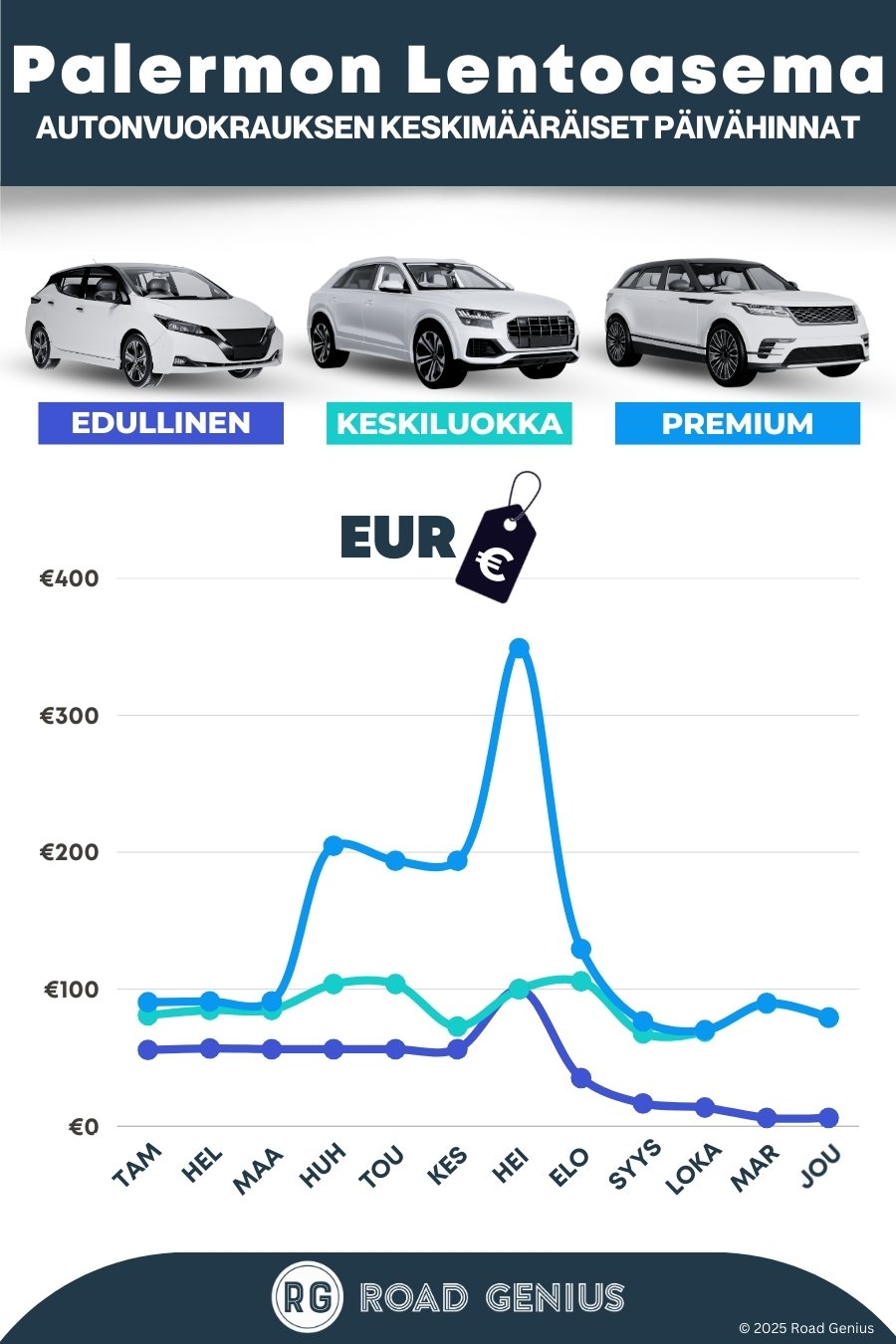 Keskimäärin autonvuokraus kohteessa Palermon lentoasema maksaa noin €89 päivässä, ja halvimmat vuokraukset ovat saatavilla alkaen €6 päivässä.