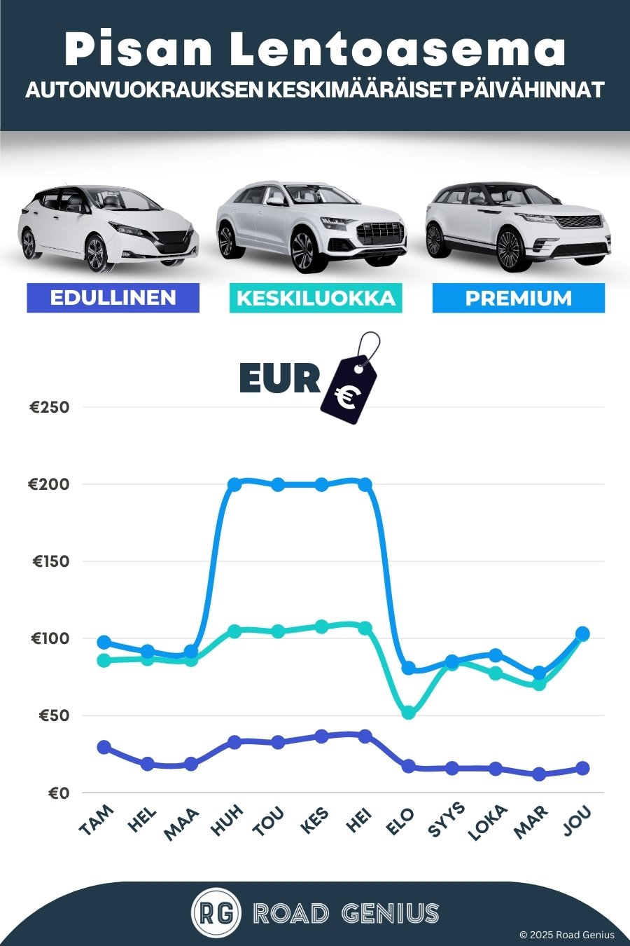 Keskimäärin autonvuokraus kohteessa Pisan lentoasema maksaa noin €80 päivässä, ja halvimmat vuokraukset ovat saatavilla alkaen €12 päivässä.