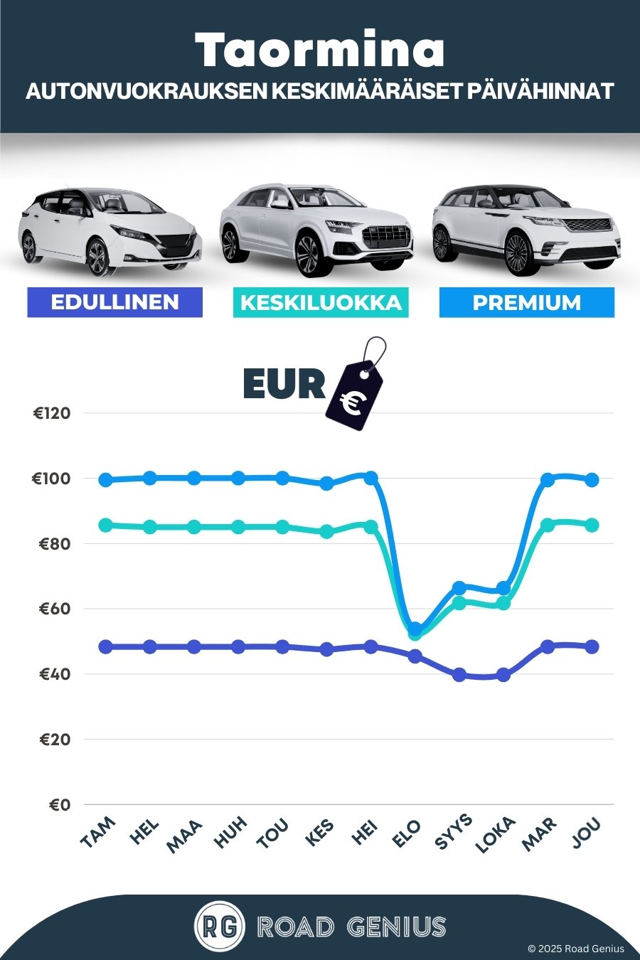 Keskimäärin autonvuokraus kohteessa Taormina maksaa noin €72 päivässä, ja halvimmat vuokraukset ovat saatavilla alkaen €40 päivässä.