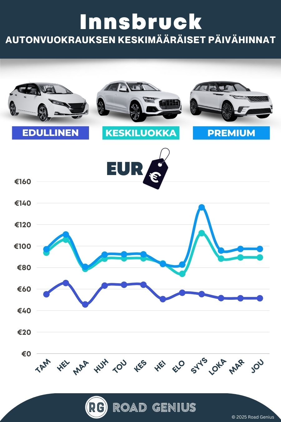 Keskimäärin autonvuokraus kohteessa Innsbruck maksaa noin €81 päivässä, ja halvimmat vuokraukset ovat saatavilla alkaen €46 päivässä.