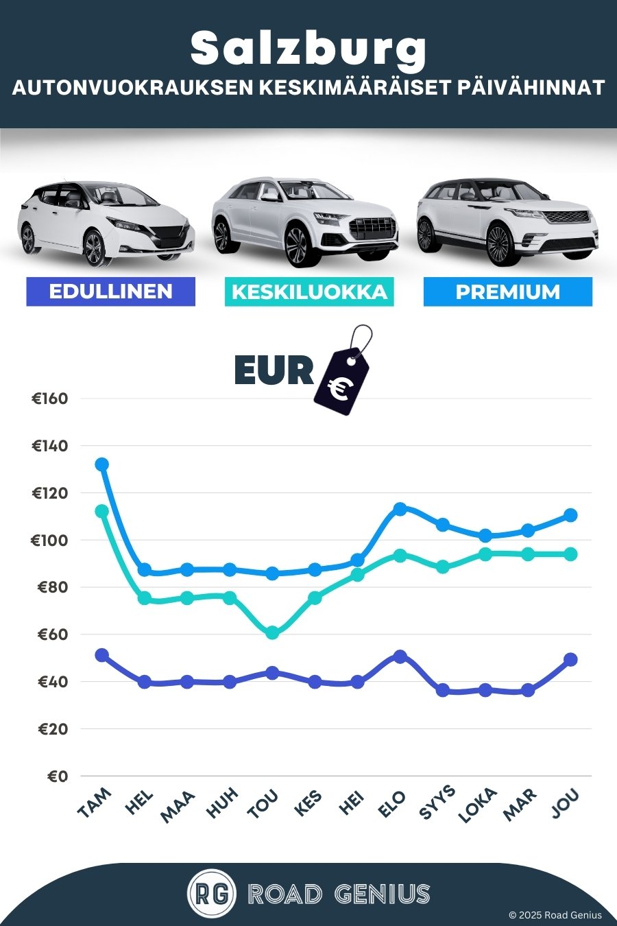 Keskimäärin autonvuokraus kohteessa Salzburg maksaa noin €76 päivässä, ja halvimmat vuokraukset ovat saatavilla alkaen €36 päivässä.