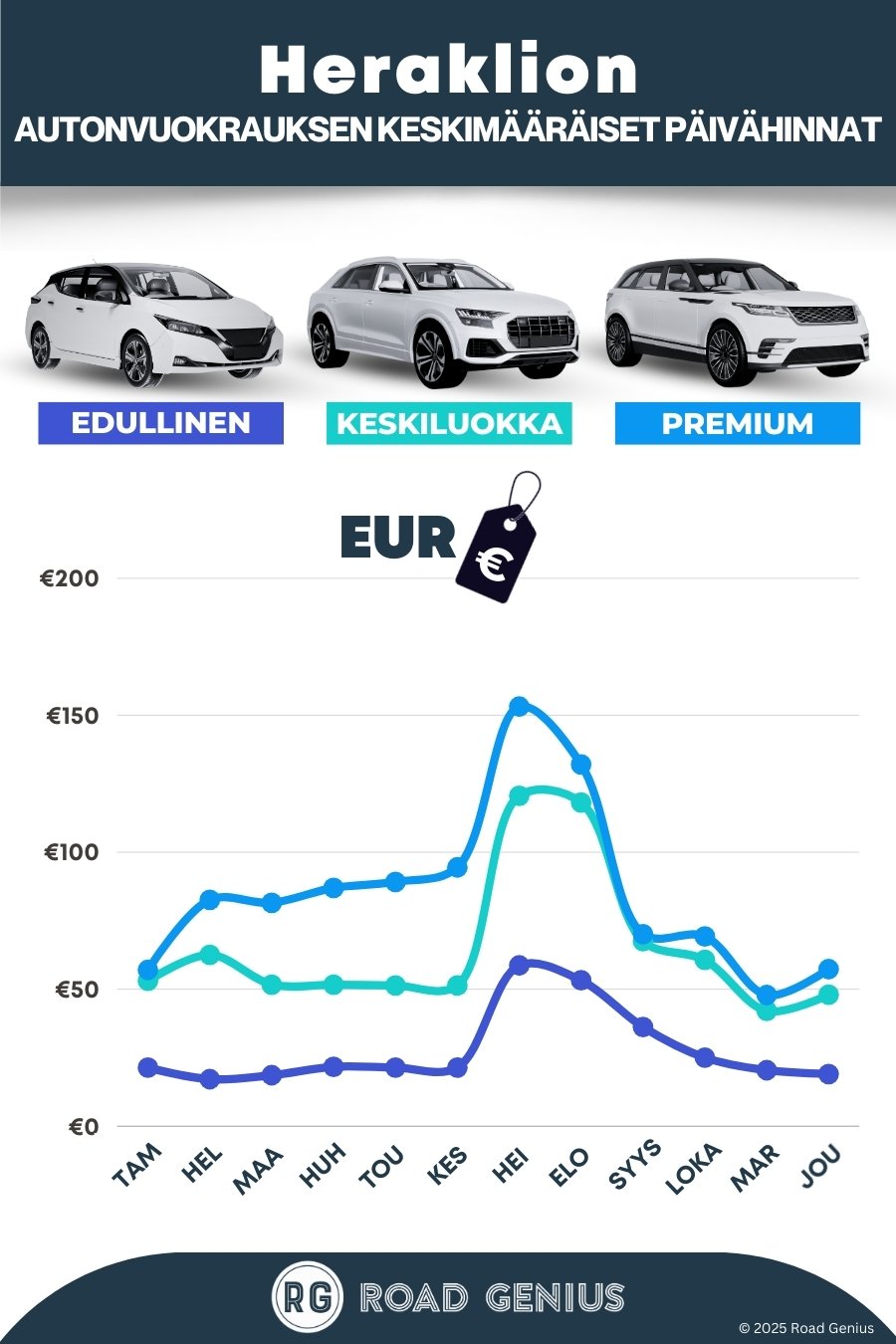 Keskimäärin autonvuokraus kohteessa Heraklion maksaa noin €59 päivässä, ja halvimmat vuokraukset ovat saatavilla alkaen €17 päivässä.