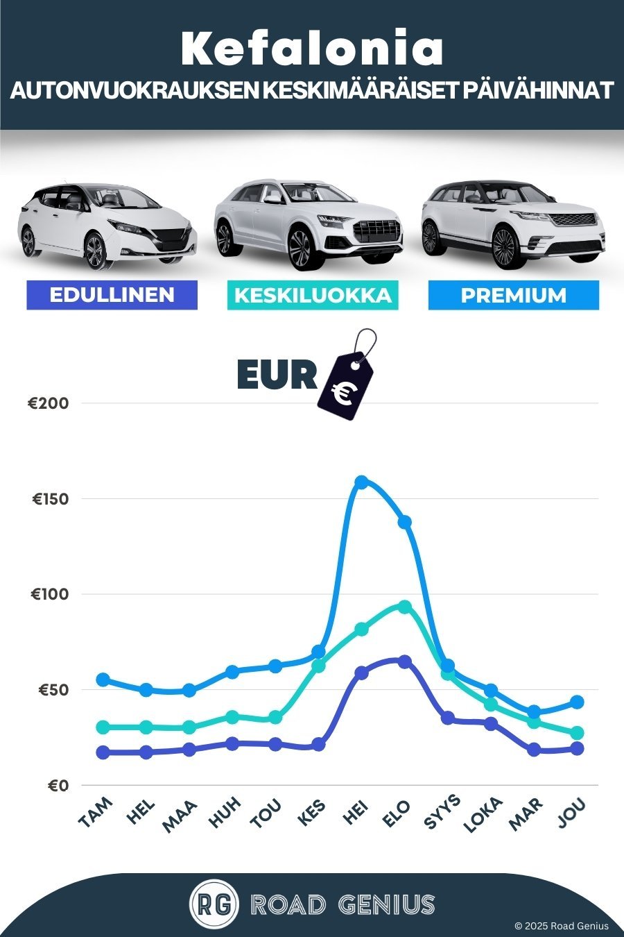 Keskimäärin autonvuokraus kohteessa Kefalonia maksaa noin €48 päivässä, ja halvimmat vuokraukset ovat saatavilla alkaen €17 päivässä.