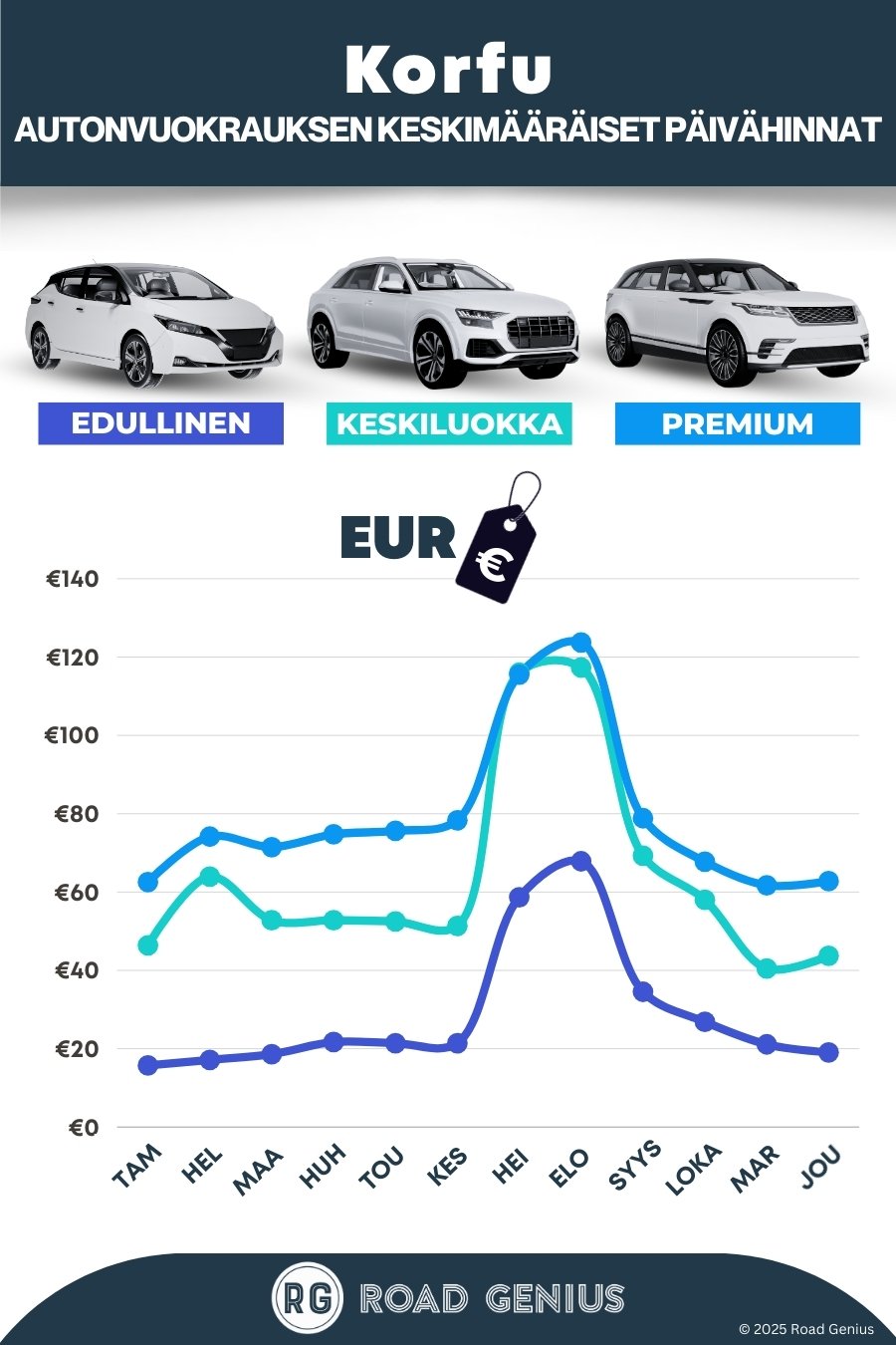 Keskimäärin autonvuokraus kohteessa Korfu maksaa noin €57 päivässä, ja halvimmat vuokraukset ovat saatavilla alkaen €16 päivässä.