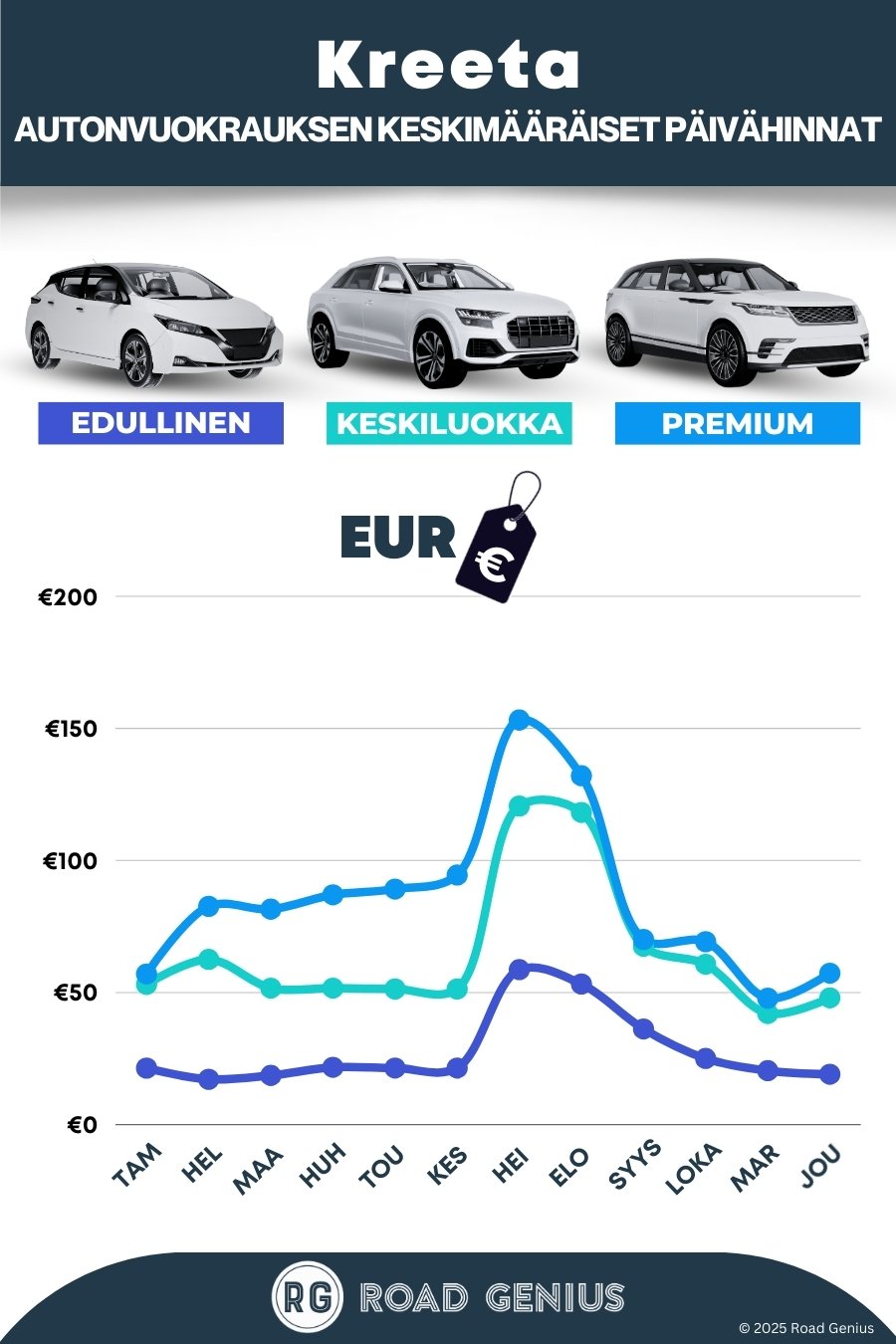 Keskimäärin autonvuokraus Kreetalla maksaa noin 59 € päivässä, ja edullisimmat vuokraukset ovat saatavilla alkaen 17 € päivässä.