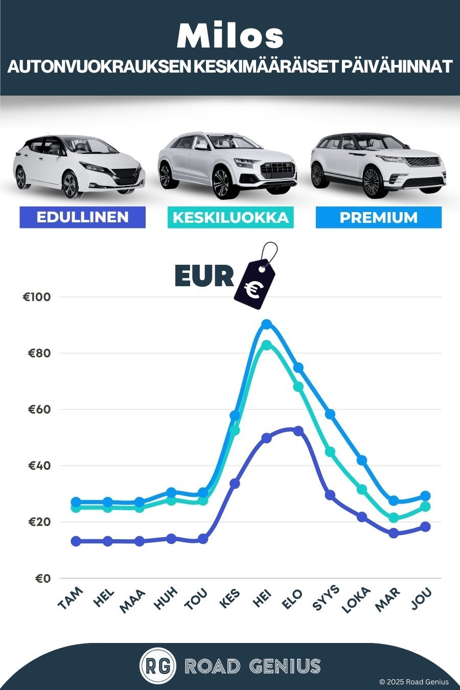 Keskimäärin autonvuokraus kohteessa Milos maksaa noin €35 päivässä, ja halvimmat vuokraukset ovat saatavilla alkaen €13 päivässä.