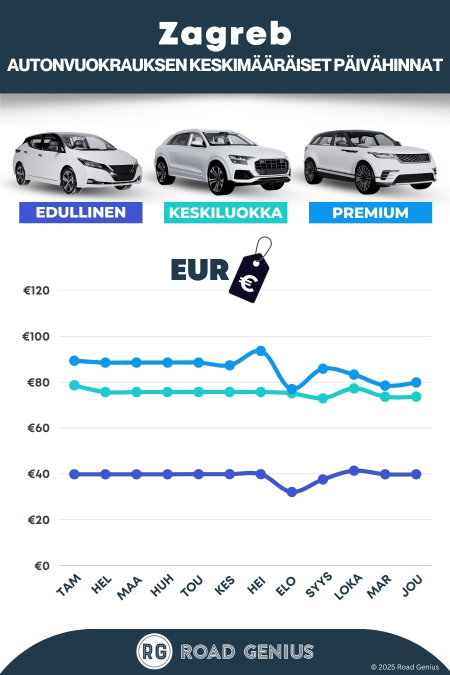 Keskimäärin autonvuokraus kohteessa Zagreb maksaa noin €67 päivässä, ja halvimmat vuokraukset ovat saatavilla alkaen €32 päivässä.