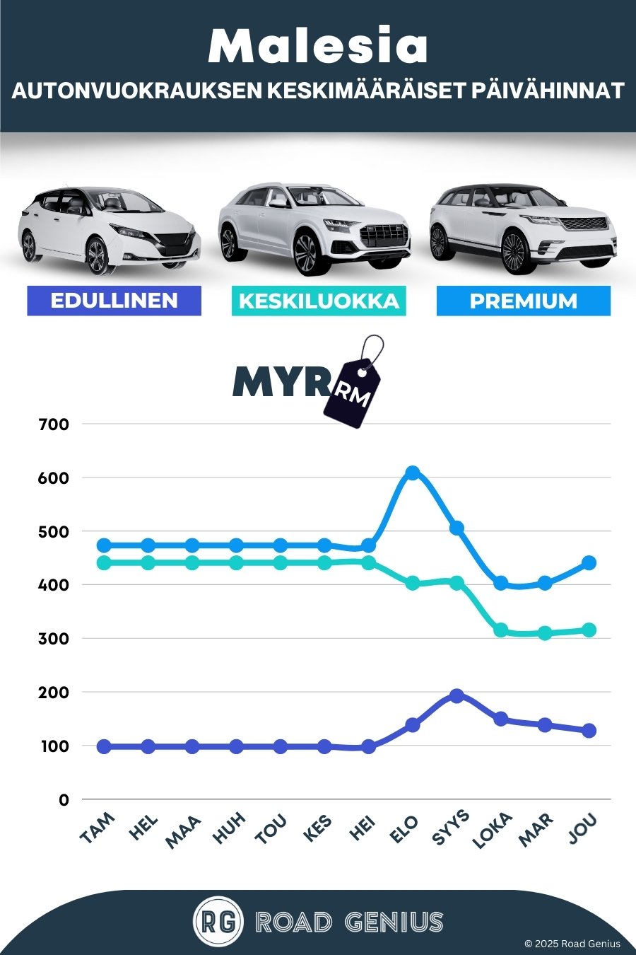 Keskimäärin autonvuokraus Malesiassa maksaa noin 331 MYR päivässä, ja edullisimmat vuokraukset ovat saatavilla alkaen 98 MYR päivässä.