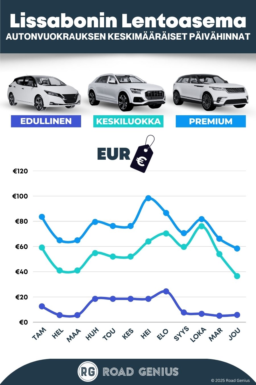 Keskimäärin autonvuokraus Lissabonin lentoasemalla maksaa noin 48 € päivässä, ja edullisimmat vuokraukset ovat saatavilla alkaen 5 € päivässä.