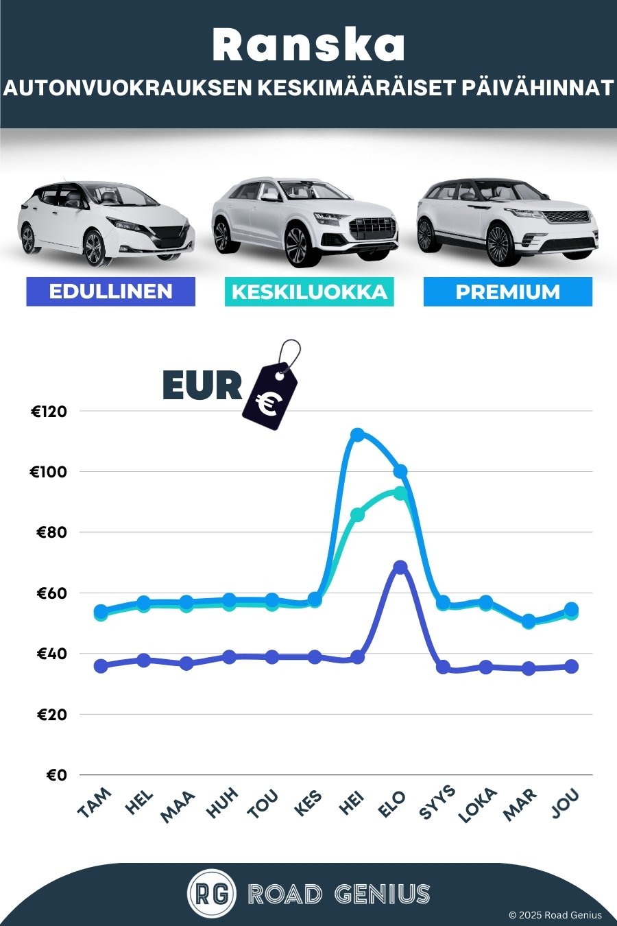 Keskimäärin autonvuokraus Ranskassa maksaa noin 55 € päivässä, ja edullisimmat vuokraukset ovat saatavilla alkaen 35 € päivässä.