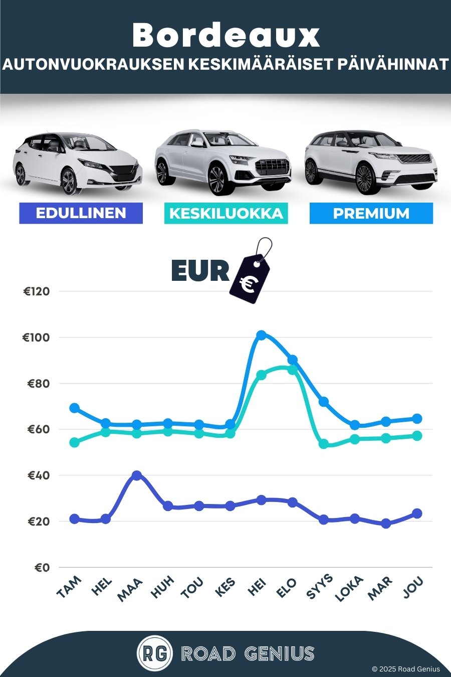 Keskimäärin autonvuokraus kohteessa Bordeaux maksaa noin €52 päivässä, ja halvimmat vuokraukset ovat saatavilla alkaen €19 päivässä.