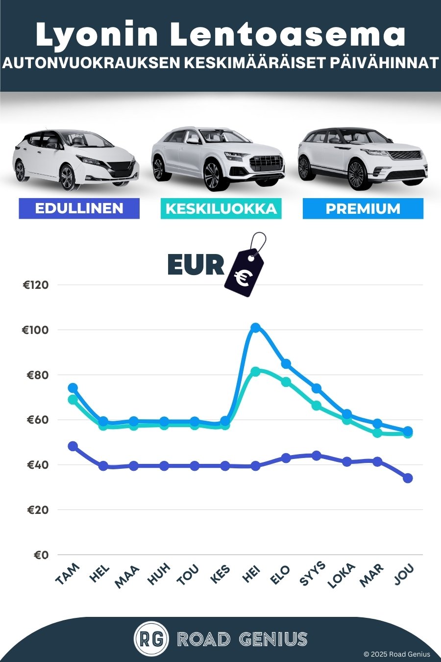 Keskimäärin autonvuokraus kohteessa Lyonin lentoasema maksaa noin €57 päivässä, ja halvimmat vuokraukset ovat saatavilla alkaen €34 päivässä.