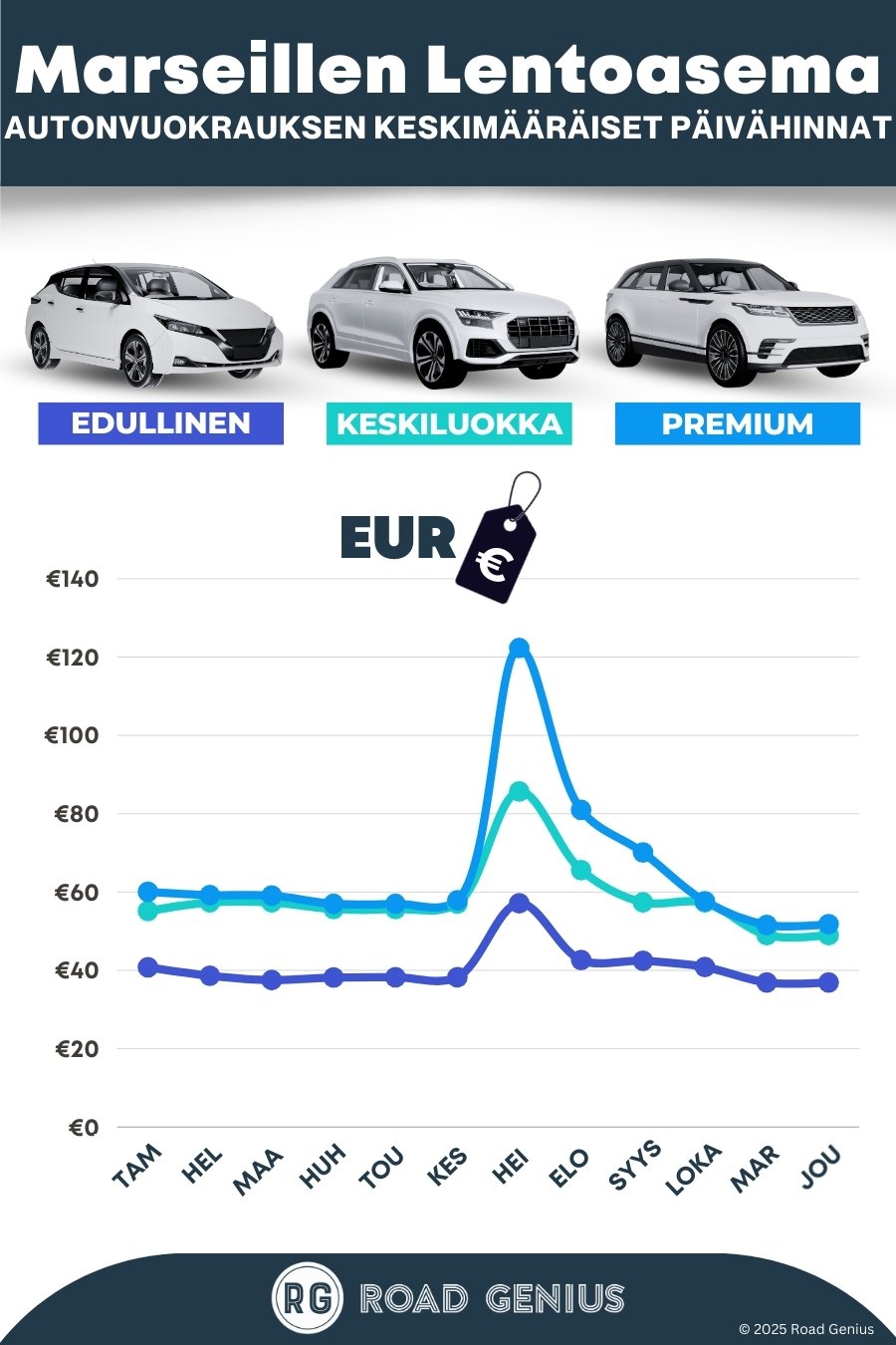 Keskimäärin autonvuokraus kohteessa Marseillen lentoasema maksaa noin €55 päivässä, ja halvimmat vuokraukset ovat saatavilla alkaen €37 päivässä.