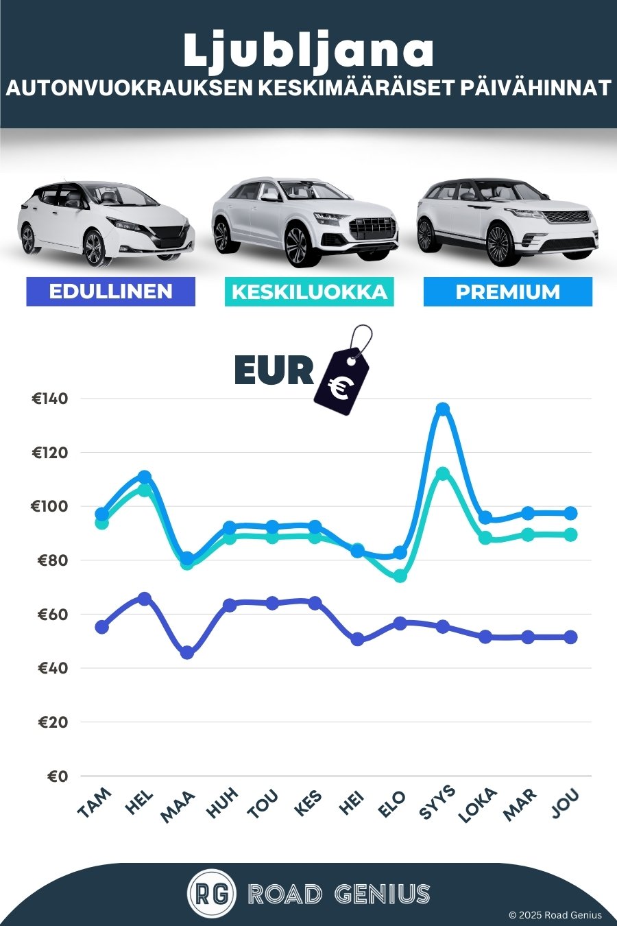 Keskimäärin autonvuokraus Ljubljanassa maksaa noin 81 € päivässä, ja edullisimmat vuokraukset ovat saatavilla alkaen 46 € päivässä.