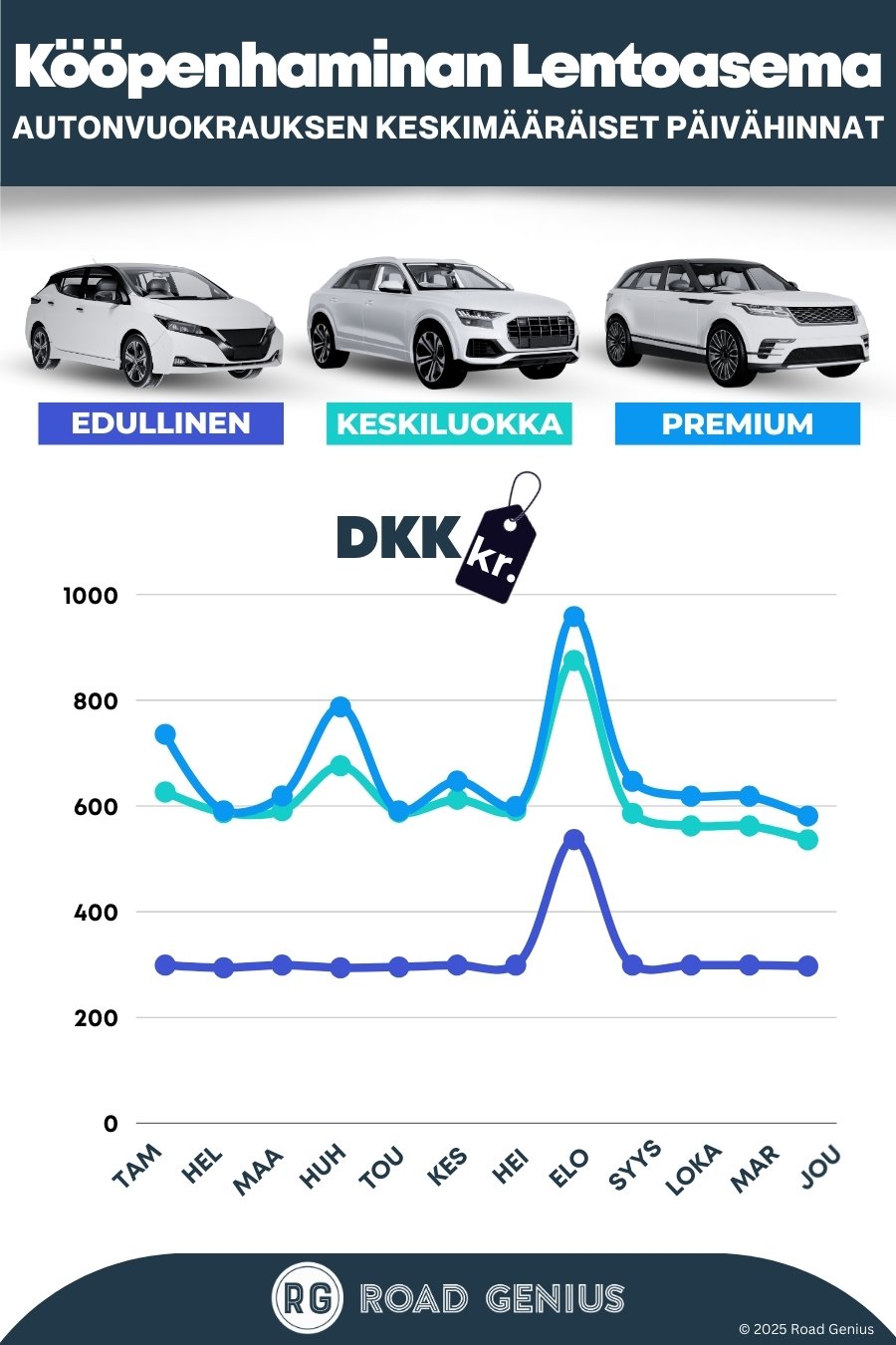 Keskimäärin autonvuokraus kohteessa Kööpenhaminan lentoasema maksaa noin 533 kr päivässä, ja halvimmat vuokraukset ovat saatavilla alkaen 294 kr päivässä.