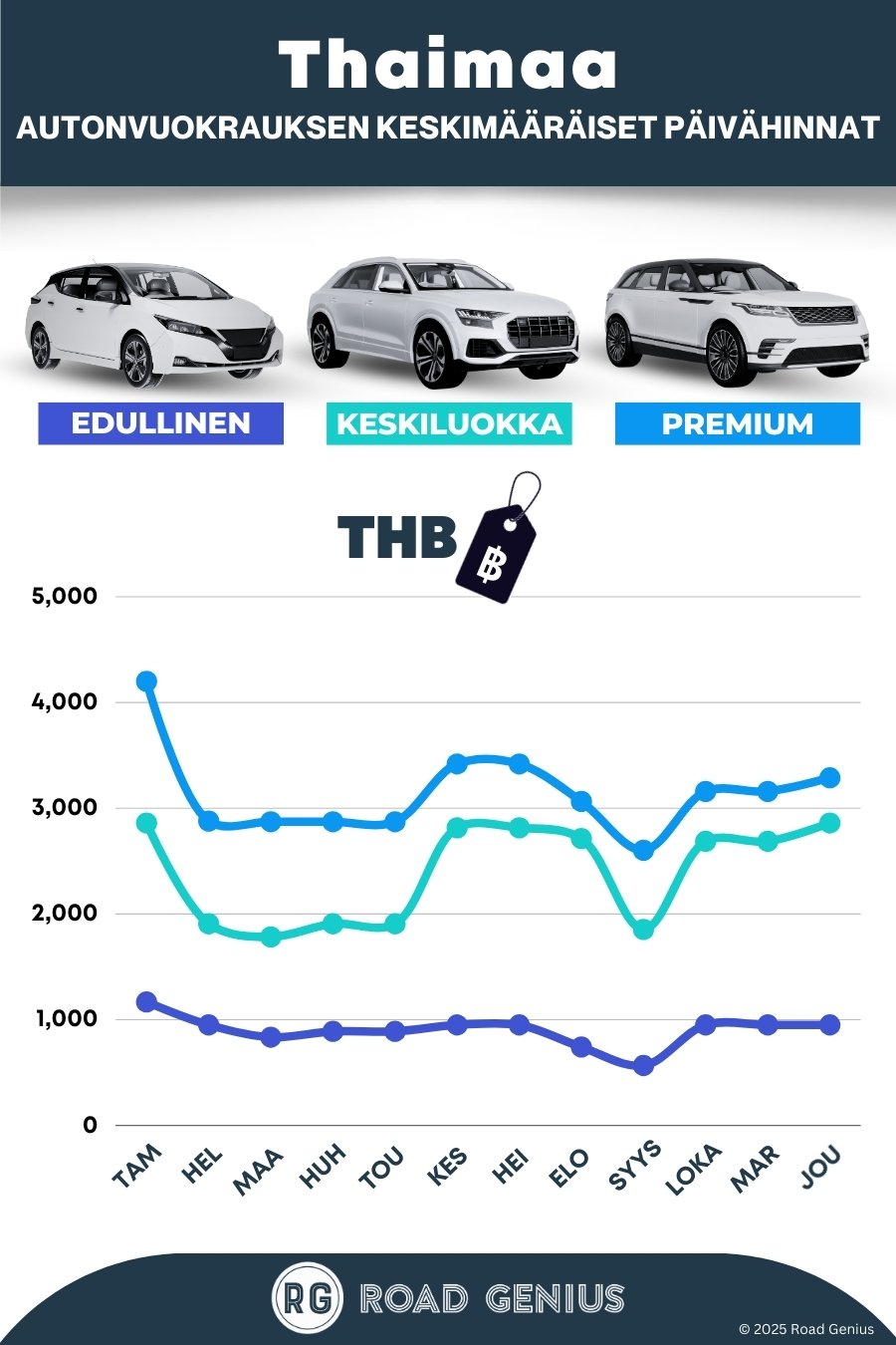 Keskimäärin autonvuokraus Thaimaassa maksaa noin 2 150 THB päivässä, ja edullisimmat vuokraukset ovat saatavilla alkaen 566 THB päivässä.