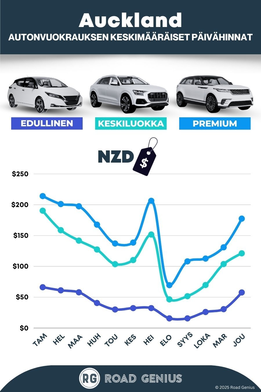 Keskimäärin autonvuokraus Aucklandissa maksaa noin 103 NZD päivässä, ja edullisimmat vuokraukset ovat saatavilla alkaen 16 NZD päivässä.