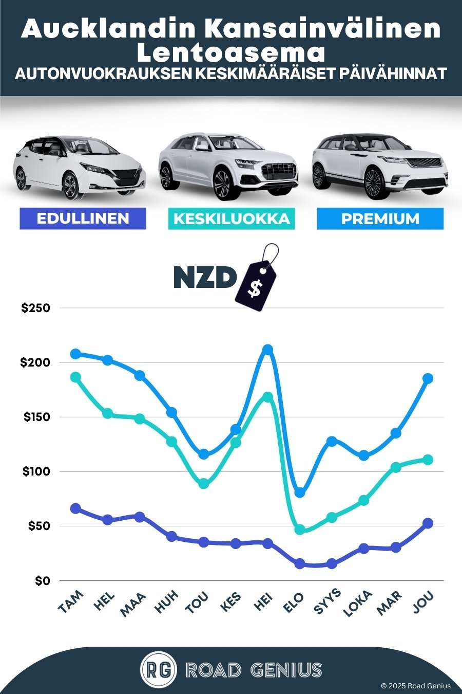 Keskimäärin autonvuokraus Aucklandin kansainvälisellä lentoasemalla maksaa noin 103 NZD päivässä, ja edullisimmat vuokraukset ovat saatavilla alkaen 16 NZD päivässä.