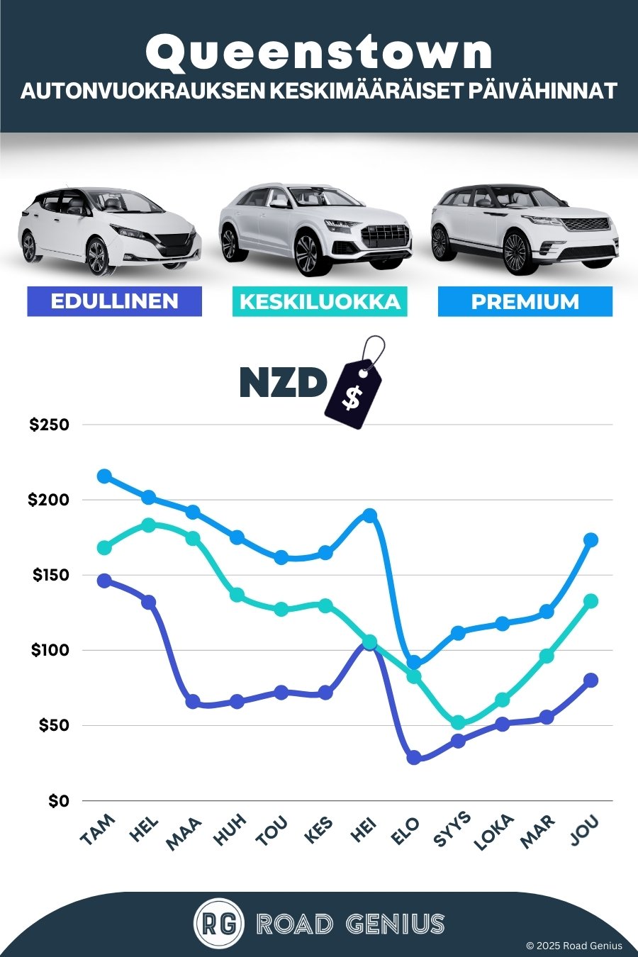 Keskimäärin autonvuokraus Queenstownissa maksaa noin 119 NZD päivässä, ja edullisimmat vuokraukset ovat saatavilla alkaen 29 NZD päivässä.