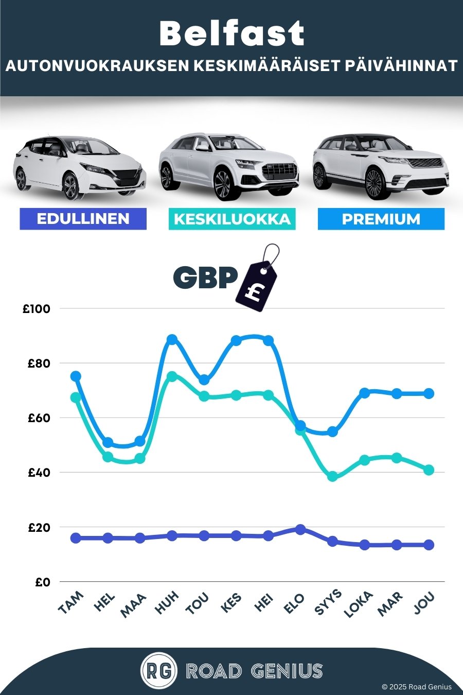 Keskimäärin autonvuokraus Belfastissa maksaa noin 47 € päivässä, ja edullisimmat vuokraukset ovat saatavilla alkaen 13 € päivässä.