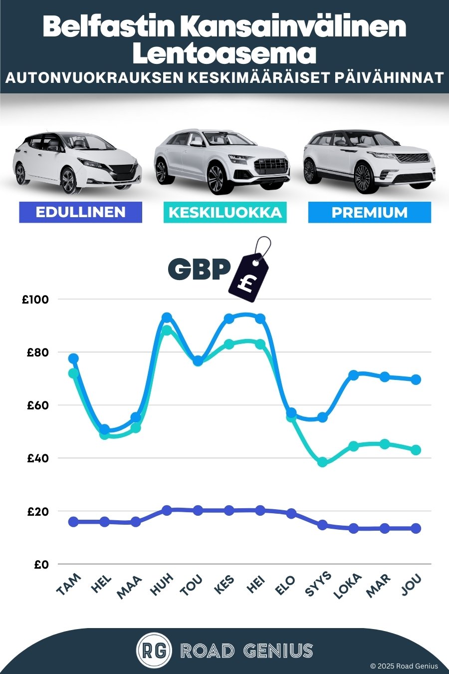 Keskimäärin autonvuokraus Belfastin kansainvälisellä lentoasemalla maksaa noin 50 € päivässä, ja edullisimmat vuokraukset ovat saatavilla alkaen 13 € päivässä.