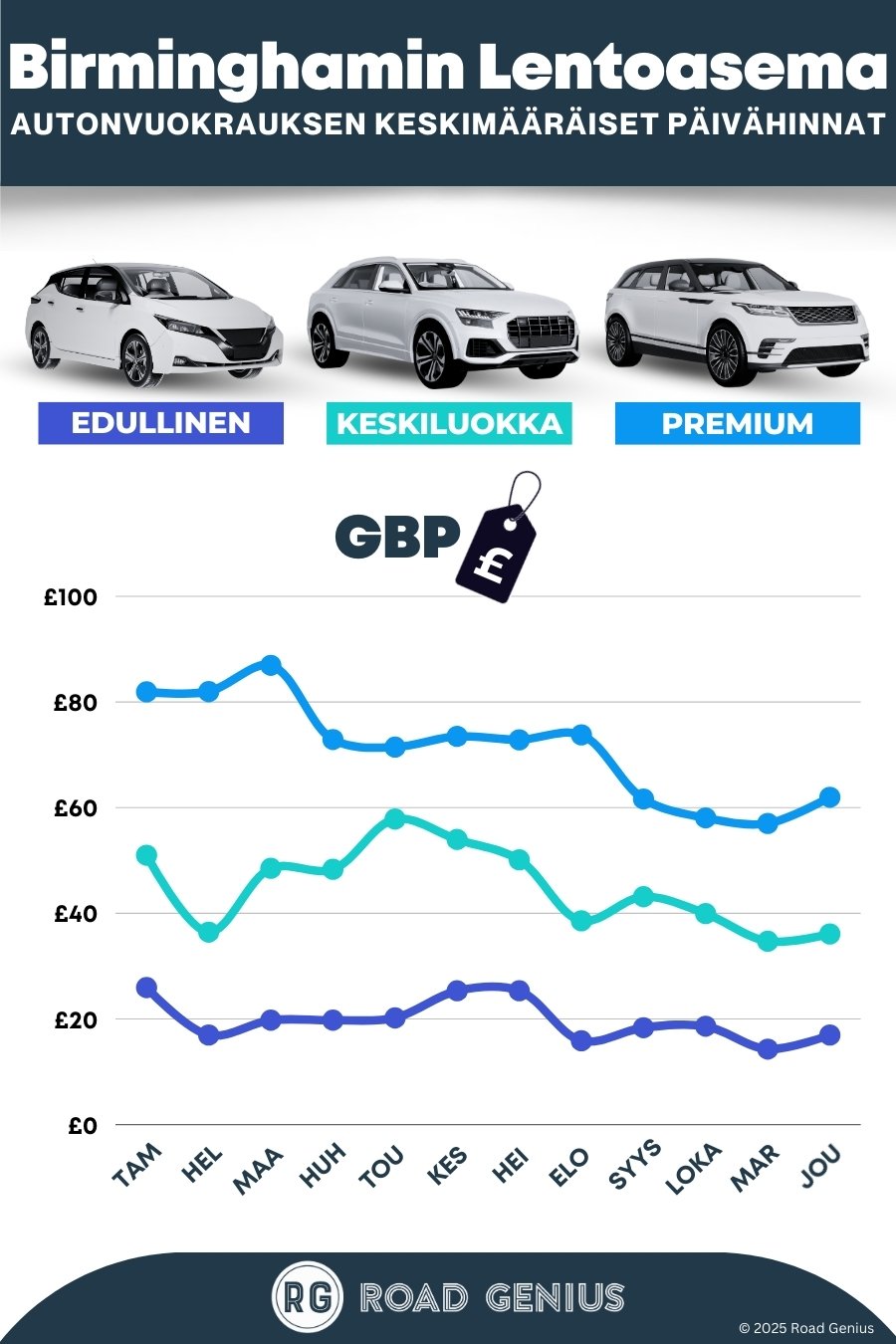 Keskimäärin autonvuokraus Birminghamin lentoasemalla maksaa noin 45 € päivässä, ja edullisimmat vuokraukset ovat saatavilla alkaen 14 € päivässä.