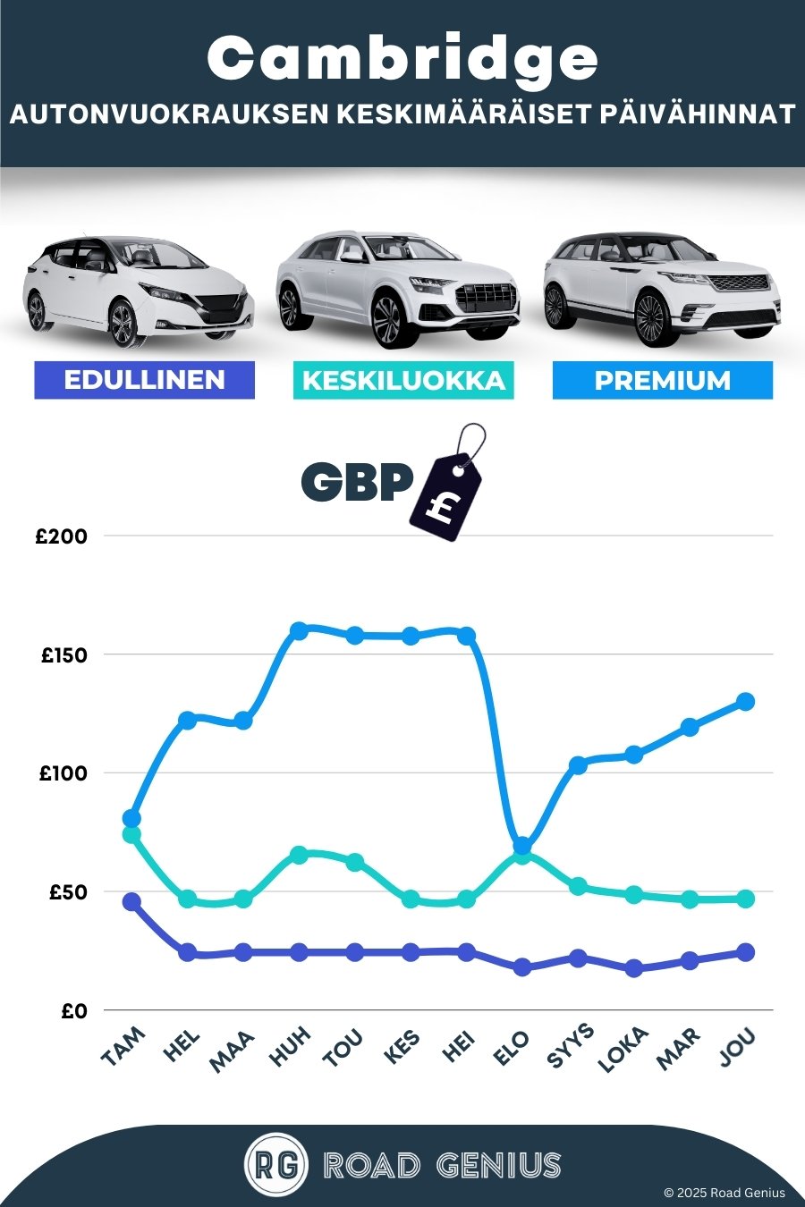 Keskimäärin autonvuokraus Cambridgessa maksaa noin 67 € päivässä, ja edullisimmat vuokraukset ovat saatavilla alkaen 18 € päivässä.