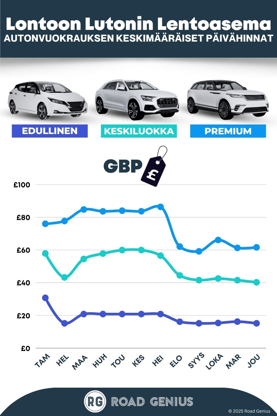 Keskimäärin autonvuokraus London Lutonin lentoasemalla maksaa noin 48 € päivässä, ja edullisimmat vuokraukset ovat saatavilla alkaen 15 € päivässä.