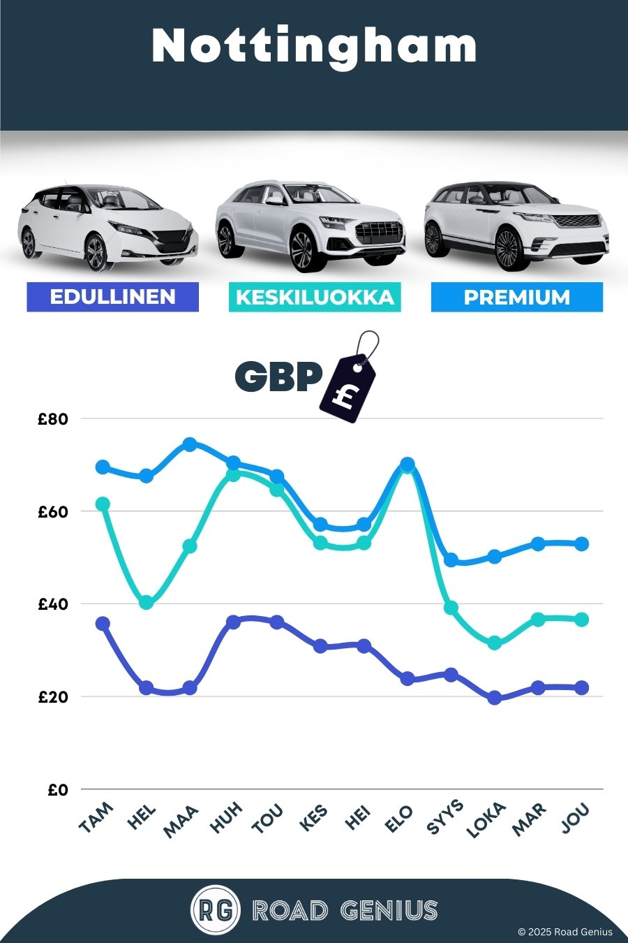 Keskimäärin autonvuokraus Nottinghamissa maksaa noin 46 € päivässä, ja edullisimmat vuokraukset ovat saatavilla alkaen 20 € päivässä.