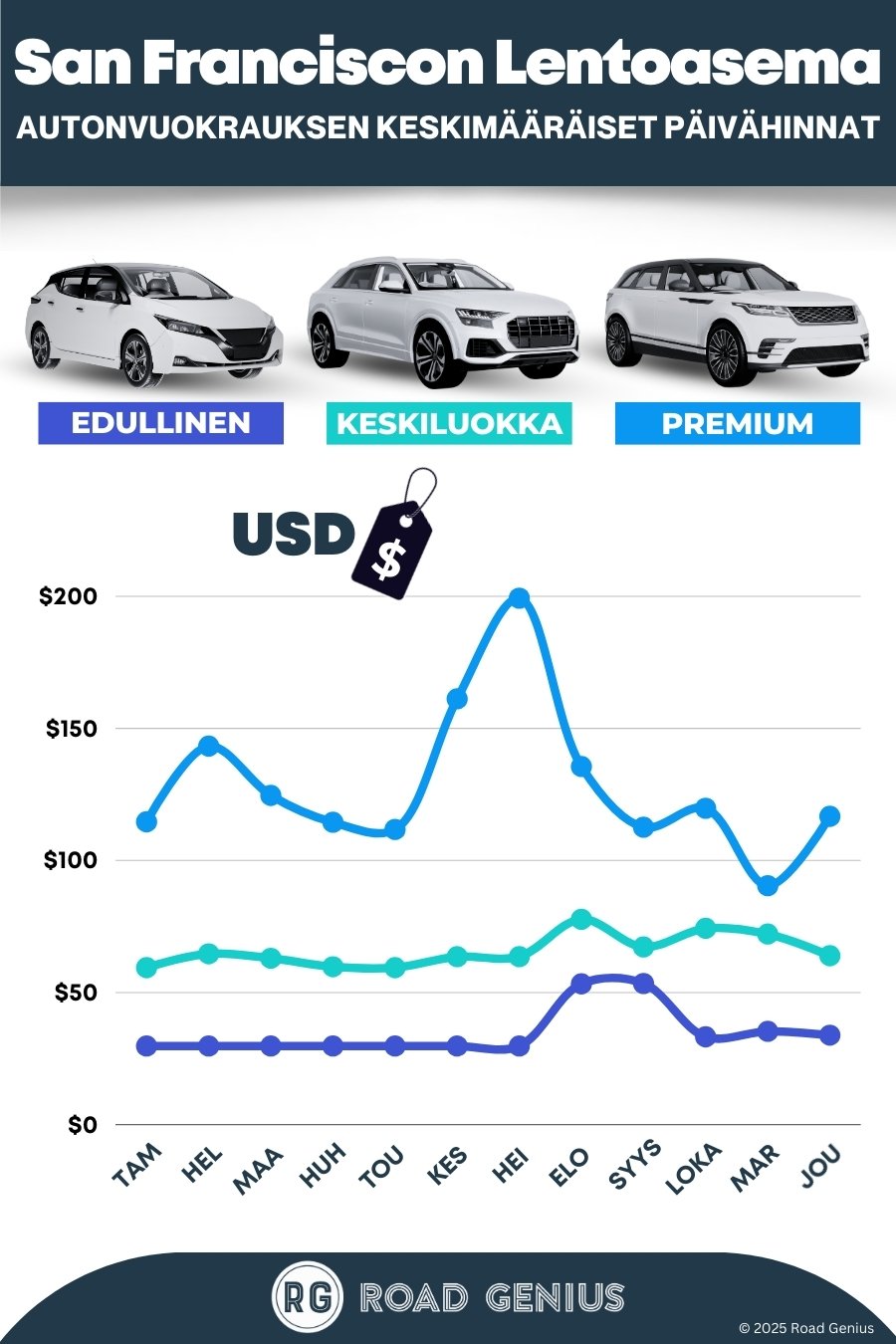 Keskimäärin autonvuokraus San Franciscon lentoasemalla maksaa noin 76 USD päivässä, ja edullisimmat vuokraukset ovat saatavilla alkaen 30 USD päivässä.