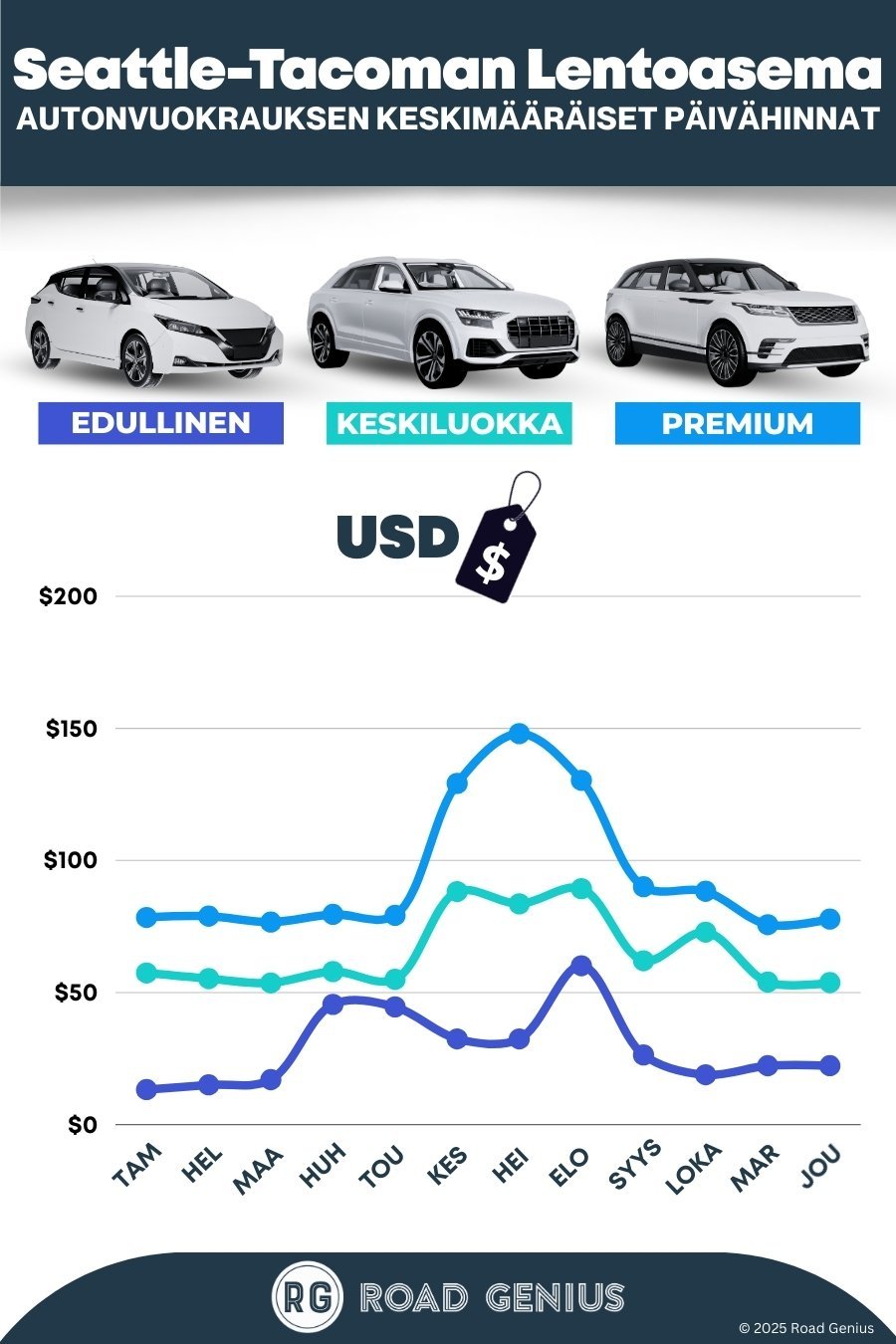 Keskimäärin autonvuokraus Seattle–Tacoman lentoasemalla maksaa noin 63 USD päivässä, ja edullisimmat vuokraukset ovat saatavilla alkaen 13 USD päivässä.