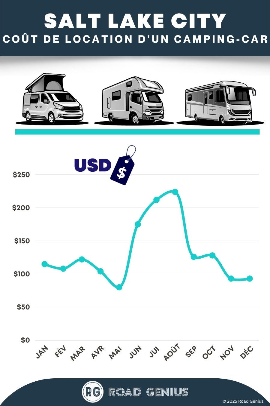 Louer un camping-car à Salt Lake City dépend de plusieurs facteurs, tels que la taille du camping-car, son ancienneté, les équipements disponibles, la durée de location, la saison, ainsi que les lieux de prise en charge et de restitution.