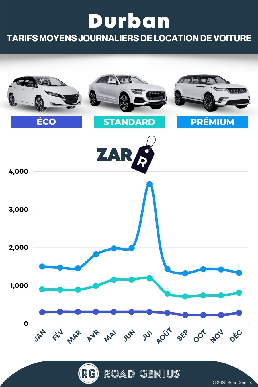 En moyenne, la location de voiture à Durban coûte environ 983 ZAR par jour, les offres les moins chères étant disponibles dès 230 ZAR par jour.