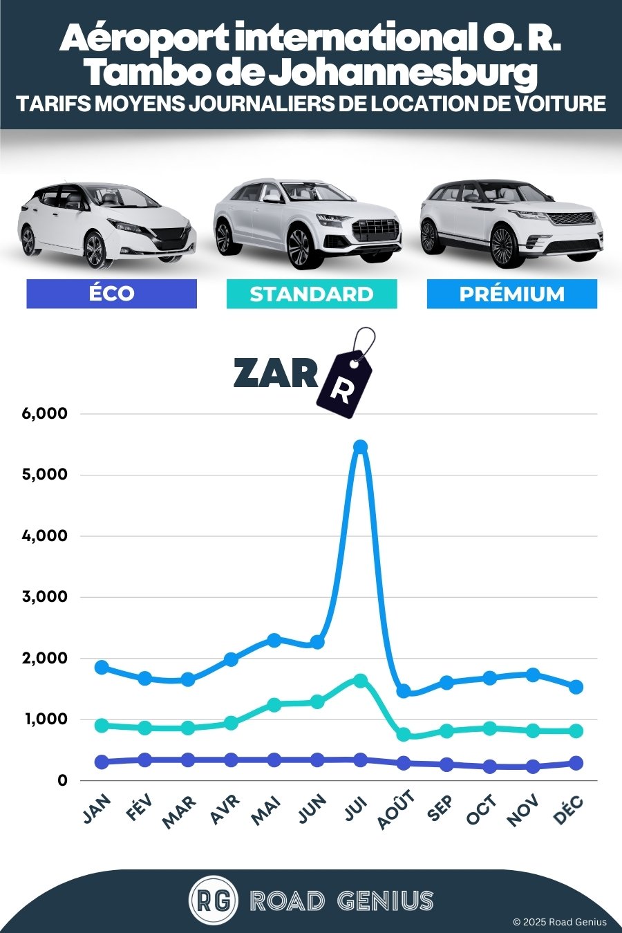 En moyenne, la location de voiture à l’aéroport O. R. Tambo de Johannesburg coûte environ 1 128 ZAR par jour, les offres les moins chères étant disponibles dès 230 ZAR par jour.